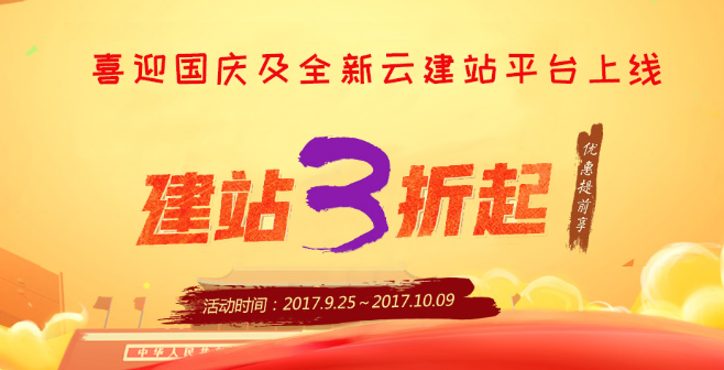 热烈庆祝云建站平台升级成功及庆祝十一国庆,网博资源特出有史以来特大优惠,云建站营销型建站,在原来5折优惠基础上,在9月25-10月9日期间,凡是订购的客户均可以享受3折优惠,力度巨大,抢到即使赚到!