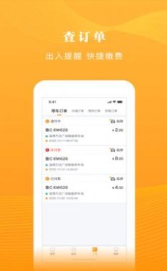 2、查订单,出入提醒,快捷缴费,停车场停车位选择,订单可进行查询。