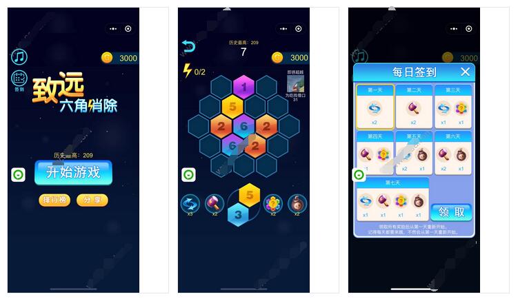 致远六角消除微信小游戏是一款益智、休闲又好玩的六角消除游戏,游戏中使用3个及以上相同的数字方块可消除并合成更大的数字,消除越多得分越多。游戏增加了四种道具可帮助玩家更轻松的消除方块,另外游戏还设有微信好友排行榜功能,增加好友间互动和趣味性,每日签到功能可获取丰富的道具。