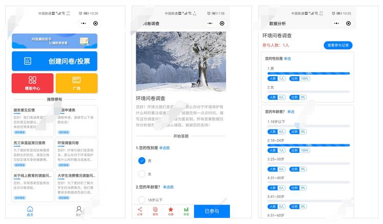 问卷调研助手微信小程序是一款专业的问卷调研小程序,可以简单快速的创建问卷调查与投票等调研活动,支持生成二维码推广海报和多渠道分享,且拥有详细的数据统计与分析,帮助用户高效的完成数据调研与统计,小程序还拥有问卷投票展示与搜索的“广场模块”适合各种调研活动。